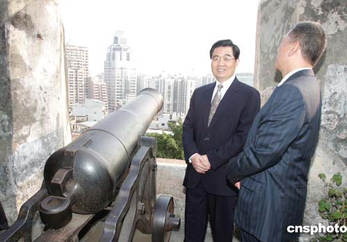 12月19日下午,首次到達澳門的胡錦濤主席饒有興趣地參觀了當?shù)刂包c大炮臺。作者:宗金柱