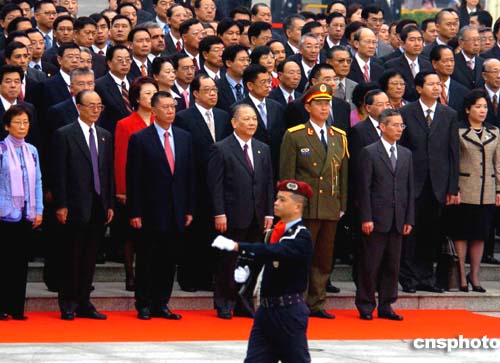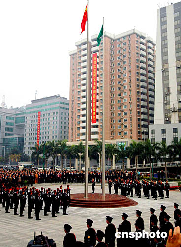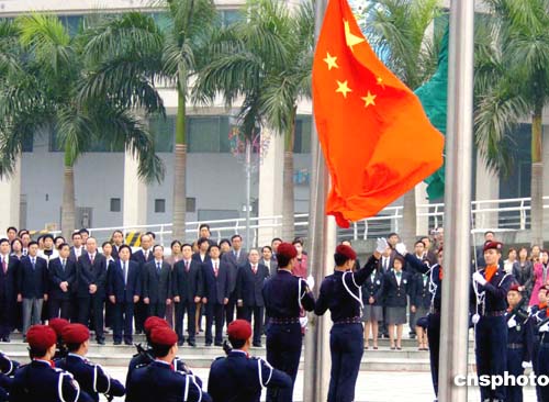 澳門特別行政區(qū)行政長官何厚鏵、解放軍駐澳門部隊司令員劉聯(lián)華20日上午出席莊嚴的升旗儀式,慶祝澳門回歸祖國五周年。作者:宋吉河