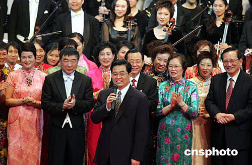 十二月二十日上午,國(guó)家主席胡錦濤在澳門文化中心觀看了慶祝回歸五周年文藝演出后,上臺(tái)與演員們握手并表示感謝。作者:宗金柱