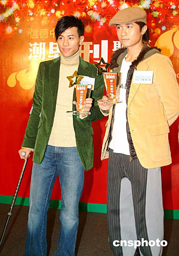 踏入年終,香港樂壇頒獎(jiǎng)禮一觸即發(fā),眾歌星紛紛外出宣傳拉票。12月23日,信德中心邀請被喻為樂壇『新四天天王』的其中兩位大熱型男古巨基、梁漢文出席慈善活動。大會特別頒發(fā)『2004年度樂壇愛心型男金獎(jiǎng)』的獎(jiǎng)座感謝古巨基[右]、梁漢文的鼎力支持。作者:洪少葵