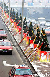 十二月二十四日,北京東三環(huán)農(nóng)展橋兩邊立起了一百多棵圣誕樹,并在路旁裝點了彩色的塑料花,為節(jié)日增添了喜慶的氣氛。作者:韓藝冰