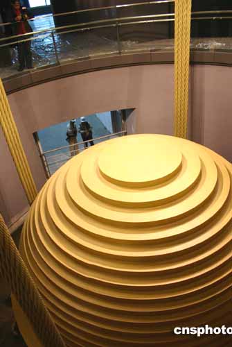 | 臺(tái)北101大樓八十九層觀景臺(tái)12月28日下午向媒體開放,樓內(nèi)安裝的世界最大風(fēng)阻尼器引人注目。該風(fēng)阻尼器球體直徑五點(diǎn)五米,重達(dá)六百六十公噸,從大樓九十二層懸掛到八十八層,對(duì)因地震、強(qiáng)風(fēng)造成的水平偏移能產(chǎn)生百分之四十以上的反作用,是世界最大也是唯一外露的風(fēng)阻尼器。作者:黃少華
