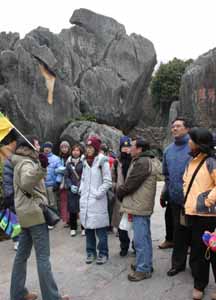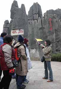 12月31日,昆明的氣溫降到了今年入冬以來的最低,但石林的美景仍吸引了大批游客,這位導游仍耐心的講解,使游客對石林仍覺不需此行。據(jù)了解,截止12月31日,石林全年接待游客突破210萬人,繼昆明世博會后再創(chuàng)歷史新高。(作者:梁鑫)