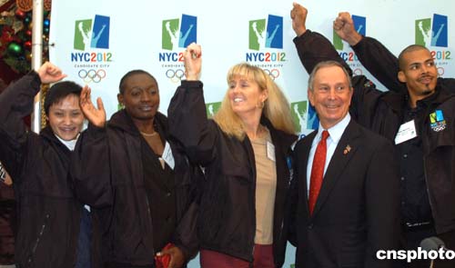 當(dāng)?shù)貢r間二零零四年十二月三十一日,包括昔日中國“跳水皇后”高敏(左一)在內(nèi)的八名奧運冠軍在應(yīng)邀作為嘉賓出席紐約奧申委舉辦的紐約申辦二零一二年奧運會活動,和紐約市長布隆博格(右二)一起為紐約申奧成功加油。作者:趙海燕