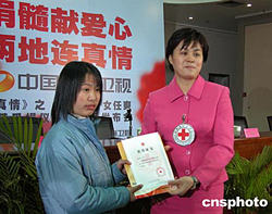 1月3日,湖南省副省長(zhǎng)、省紅十字會(huì)會(huì)長(zhǎng)甘霖(右)在長(zhǎng)沙向捐獻(xiàn)骨髓的路敏頒發(fā)榮譽(yù)證書(shū)。來(lái)自湖南農(nóng)業(yè)大學(xué)的路敏今日將啟程前往北京提供造血干細(xì)胞,以救助遼寧14歲的白血病少女任爽。作者:鄧霞