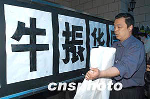 五月十五日上午,因車禍身亡的著名演員牛振華追悼會在北京八寶山舉行,牛振華的家人與數(shù)百名生前好友前來為其送行。圖為親友布置追悼會現(xiàn)場。中新社記者:張宇