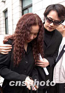 五月十五日上午,因車禍身亡的著名演員牛振華追悼會在北京八寶山舉行,牛振華生前好友蔡明在朋友的攙扶下走出告別室。中新社記者:張宇