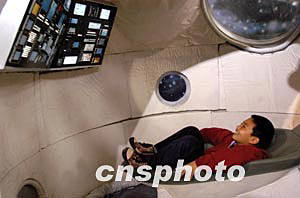 五月十五日,一名北京學(xué)童在當(dāng)日開幕的2004年全國(guó)科技活動(dòng)周暨北京科技周展會(huì)上,模擬中國(guó)首位宇航員楊利偉乘坐神舟五號(hào)載人飛船太空倉的座椅上,用心感受太空飛行的樂趣。中新社記者:鄒憲