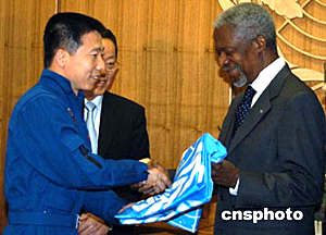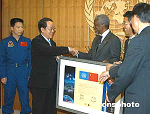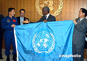 中國首飛航天員楊利偉(左)代表中國,向聯(lián)合國秘書長安南(右)移交了“神舟”五號(hào)飛船所攜載的聯(lián)合國旗。作者:陳建