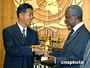 圖為中國常駐聯(lián)合國代表王光亞(左二)向聯(lián)合國秘書長安南(右三)贈(zèng)送交旗證書,表達(dá)中國和平利用太空、造福全人類的美好愿望,以及對聯(lián)合國宗旨和原則的支持。