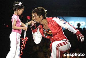“齊長大”任賢齊北京演唱會五月二十二日晚在首都體育館舉行,演唱會的高潮出現(xiàn)在“香車美女”環(huán)節(jié),任賢齊為一名5歲的小美女單膝跪地送上玫瑰并騎上摩托帶她環(huán)場一周。中新社記者:高遠(yuǎn)