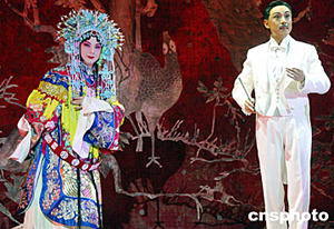 為紀(jì)念中國最著名的京劇大師梅蘭芳先生誕辰一百一十周年,北京京劇院演出的京劇大型交響劇詩《梅蘭芳》五月二十五日晚走進(jìn)北京大學(xué)百年講堂,如詩如畫的舞臺設(shè)計和京劇藝術(shù)家們精湛的演技贏得大學(xué)生的陣陣喝彩。京劇大型交響劇詩《梅蘭芳》擷取了抗日戰(zhàn)爭期間梅蘭芳蓄須明志,拒絕為日本人演出的人生片段。圖為由北京京劇院于魁智(右)扮演的梅蘭芳先生。中新社記者:張勤