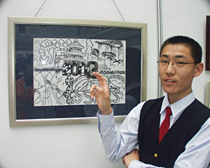 記者在展覽上看到,在寬敞的大廳內(nèi),擺滿了學生創(chuàng)作的作品,包括版畫、民間剪紙、刮畫、紙雕、面具、漫畫、海報、中國結等十多種,內(nèi)容涉及更廣,如環(huán)保、奧運會、行為規(guī)范、國慶等。十四歲的葛雅靜,看上去十分靦腆。這次展覽她如魚得水,有五幅作品入選,是所有參展學生最多的。她的刮畫極富想象力豐富,吸引觀者駐足。據(jù)她說,父母都不是從事藝術工作的,她是上藝術課上后,逐漸發(fā)現(xiàn)自己愛上畫畫了。
