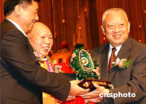 國家宗教局局長葉小文、中國佛教協(xié)會會長一誠法師,五月二十六日在香港會展中心舉行的香港佛教暨各界迎請佛指舍利瞻禮祈福大會儀式上,向香港特首董建華贈送紀(jì)念品。 作者:錢興強(qiáng)
