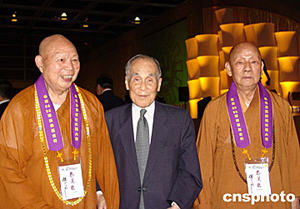 香港佛教文化產(chǎn)業(yè)董事長(zhǎng)莊世平(中)與全國(guó)佛協(xié)會(huì)長(zhǎng)一誠(chéng)法師(左)、副會(huì)長(zhǎng)根通法師(右)在慈善拍賣會(huì)上。中新社圖
