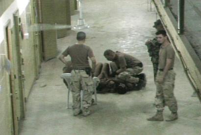 在其中一張照片中,一個(gè)美國(guó)士兵用膝蓋狠狠頂住囚犯的頸部,而這個(gè)囚犯已經(jīng)在地板上縮成一團(tuán)。不愿透露姓名的人士告訴NBC說(shuō),照片中有些人是美國(guó)軍事情報(bào)部門(mén)的官員,其中一個(gè)據(jù)信是情報(bào)官員的男子正在朝囚犯身上扔擲某種無(wú)法辨認(rèn)的物體。
