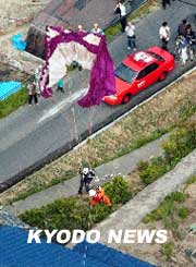 中新網(wǎng)5月27日電 日本當(dāng)?shù)貢r間26日下午1時許,由一名23歲女性駕駛的滑翔傘在日本廣島縣尾道市吉和町被距離地面約30米的高壓電線所絆,并被懸在半空中。