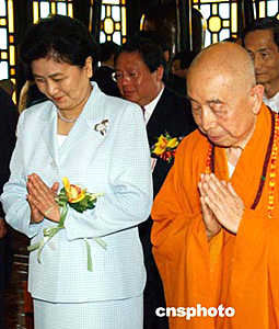 全國政協(xié)副主席、中共中央統(tǒng)戰(zhàn)部部長劉延?xùn)|,五月二十七日來到香港觀宗寺參觀,圖為劉延?xùn)|、國家宗教局局長葉小文、覺光法師、香港特區(qū)民政事務(wù)局局長何志平等一起在大雄寶殿前合影留念。作者:錢興強