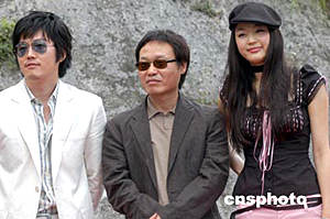 韓國(guó)電影《野蠻師姐》女主角全智賢、男主角張赫及導(dǎo)演郭在容(中)5月27日在香港元朗流浮山警署為電影宣傳造勢(shì)。作者:鄧慶樂(lè)