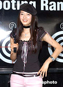 韓國(guó)電影《野蠻師姐》女主角全智賢5月27日在香港元朗流浮山警署為電影宣傳造勢(shì),手持左輪手槍一展“師姐”風(fēng)范。作者:鄧慶樂(lè)