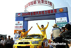 全國汽車?yán)﹀\標(biāo)賽“海淀駕校杯”北京站比賽,5月28日在北京海淀展覽館發(fā)車,臺(tái)灣藝人林志穎(右)駕駛佳通輪胎車隊(duì)車參賽。中國新聞社:盛佳鵬