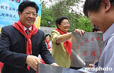 二十九日,由中國(guó)婦聯(lián)主辦的“為國(guó)教子、以德育人”家庭教育實(shí)踐活動(dòng)暨中國(guó)小公民道德建設(shè)活動(dòng)實(shí)踐基地授牌儀式在中國(guó)兒童中心舉行。圖為中共中央政治局委員王兆國(guó)(左)、中國(guó)婦聯(lián)主席顧秀蓮為承辦活動(dòng)的基地代表授牌。中新社記者:廖文靜