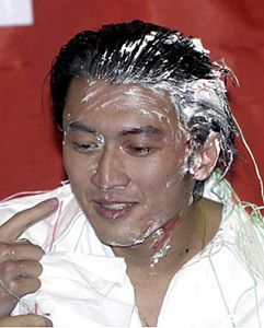 五月二十九日晚,在美卡音像為謝霆鋒新專(zhuān)輯《LISTEN UP》熱賣(mài)舉行的慶功會(huì)上,謝霆鋒毫無(wú)防備被工作人員準(zhǔn)備的雙份蛋糕“擊中”全臉,頓失俊朗形象。中新社記者:高遠(yuǎn)
