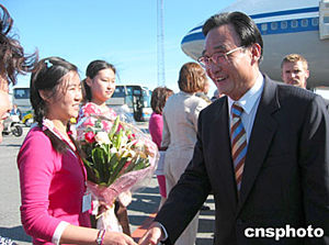 全國人大常委會委員長吳邦國五月三十一日飛抵丹麥?zhǔn)锥几绫竟,一名高中女留學(xué)生向吳邦國委員長獻(xiàn)花。作者:戴亞平