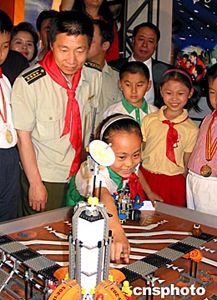 六月一日,一位小航天迷在北京中國兒童中心向航天飛行員楊利偉介紹機(jī)器人火星探險(xiǎn)車。當(dāng)天,楊利偉在孩子們的簇?fù)硐鲁鱿艘浴皩W(xué)習(xí)科學(xué)文化知識,發(fā)展祖國航天事業(yè)”為主題的兒童科技活動(dòng),與孩子們一起歡度“六一”。中新社記者:王歡