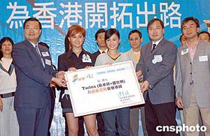 香港專業(yè)進(jìn)修學(xué)校(簡(jiǎn)稱港專)與香港電臺(tái)6月1日在香港舉行《全職青年---創(chuàng)意空間》記者會(huì),校董會(huì)主席譚耀宗(左)及校長(zhǎng)陳卓禧(右二)于儀式上邀請(qǐng)Twins為「創(chuàng)意空間」出任榮譽(yù)導(dǎo)師,并協(xié)助年輕人釋放潛能,實(shí)現(xiàn)他們的理想。作者:鄧慶樂(lè)