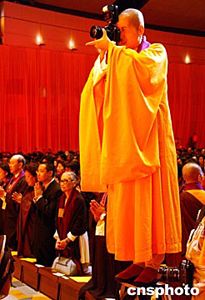 一名參加儀式的僧人登著梯子拍照。 作者:錢興強(qiáng)
