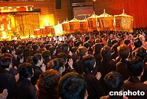 閉幕典禮前,香港佛教界還舉辦了隆重莊嚴(yán)的“圓滿傳供”禮佛儀式。約四千名佛教徒身著法衣,跪拜佛前,在悠揚(yáng)的念佛聲中,依序?qū)ⅰ跋恪、“花”、“燈”、“果”、“荼”、“食”等供品傳遞到供奉著佛指舍利和三寶佛的禮臺上,以感念佛陀恩澤,并表達(dá)對佛陀的最高敬意。整個儀式長達(dá)兩個多小時。