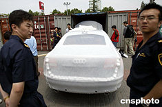 六月六日,參加二零零四年北京國際汽車展覽會(huì)的車輛陸續(xù)運(yùn)抵北京國際展覽中心。海關(guān)人員開始對(duì)參展汽車進(jìn)行逐一檢查。圖為參展車輛奧迪A8等待海關(guān)人員檢查。中新社記者:盛佳鵬