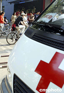 二○○四年六月七日,全國統(tǒng)一高考北京地區(qū)各考場外,特別為考生設(shè)置了醫(yī)療服務(wù)急救專用車,以確保高考順利進行。中新社記者:張勤