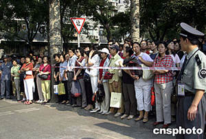 六月七日,二○○四年高考首日,北京第四中學(xué)考場(chǎng)外的考生家長(zhǎng)們焦急地等待著應(yīng)考的孩子。中新社記者:張勤