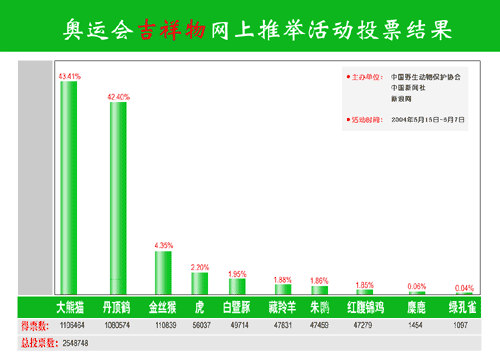 中國新聞社總編輯郭招金說,五百多萬網(wǎng)民踴躍投票,表達自己關(guān)注野生動物、保護野生動物、關(guān)注人文奧運、參與綠色奧運的熱烈情懷。他稱這次推舉活動展示的是東方人文精神的回歸,是東方文化“天人合一”的精髓的熱烈表達。