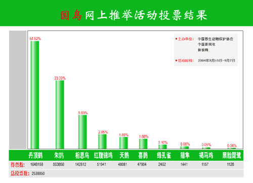 這項由中國野生動物保護協(xié)會、中國新聞社、新浪網(wǎng)聯(lián)合全國二十多家新聞網(wǎng)站舉辦的活動,在規(guī)模、規(guī)格、權(quán)威與影響上創(chuàng)造了此類推舉活動的全國之最。主辦單位今天介紹,在嚴(yán)格身份認證的情況下,二十多天的推舉活動期間,全國三十個省市自治區(qū)以及東南亞華僑、華人在內(nèi)的五百萬網(wǎng)民參與了投票。引人注目的中國傳統(tǒng)文化鳥丹頂鶴集中了網(wǎng)民近六成的投票,即便是在吉祥物推舉中,也僅以微弱差距屈居第二。