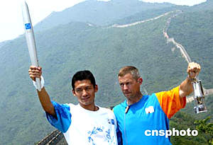 六月八日,奧運(yùn)火炬來到慕田峪長(zhǎng)城,中國(guó)足球運(yùn)動(dòng)員楊晨、雅典圣火傳遞團(tuán)團(tuán)員共同展示火炬和載有圣火火種的“馬燈”。中新社記者:鄭萍萍