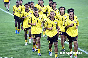 六月八日,馬來(lái)西亞足球隊(duì)在天津泰達(dá)足球場(chǎng)進(jìn)行適應(yīng)場(chǎng)地訓(xùn)練。二零零六年世界杯足球賽亞洲區(qū)預(yù)賽中國(guó)隊(duì)對(duì)馬來(lái)西亞隊(duì)的比賽將于六月九日晚在這里舉行。中新社記者:毛建軍