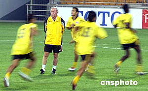 六月八日,馬來(lái)西亞足球隊(duì)在天津泰達(dá)足球場(chǎng)進(jìn)行適應(yīng)場(chǎng)地訓(xùn)練。二零零六年世界杯足球賽亞洲區(qū)預(yù)賽中國(guó)隊(duì)對(duì)馬來(lái)西亞隊(duì)的比賽將于六月九日晚在這里舉行。圖為馬來(lái)西亞主教練哈里斯正對(duì)隊(duì)員進(jìn)行現(xiàn)場(chǎng)指導(dǎo)。中新社記者:毛建軍