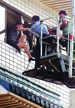 “我拍第二張照片時(shí)看見(jiàn)大廈員工順著床單下去的時(shí)候突然斷裂,一名員工突然從半空中掉下,但居然還站起走了幾步,然后才倒地!