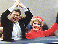 里根于1980年贏得了共和黨總統(tǒng)候選人提名,他選擇了時(shí)任美國(guó)駐聯(lián)合國(guó)大使的布什(1988年當(dāng)選美國(guó)為總統(tǒng),現(xiàn)任美國(guó)總統(tǒng)布什的父親)作他的競(jìng)選伙伴。飽受通貨膨脹折磨和長(zhǎng)時(shí)間受伊朗革命困擾的美國(guó)人把大多數(shù)選票投給了里根,他奇跡般地贏得了489張選舉人票中的440票,從而以壓倒性勝利擊敗了民主黨總統(tǒng)卡特。1984年,里根再次以前所未有的選票贏得競(jìng)選連任。