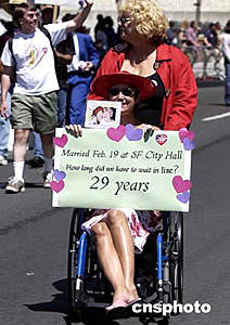 美西圣荷西市六月十三日舉行第二十九屆同性戀游行,一對相戀二十九年、今年二月十九日在加州舊金山市政府登記結(jié)婚的同性伴侶參加游行,F(xiàn)在,舊金山和圣荷西市所在的加利福尼亞州法院尚未批準(zhǔn)同性婚姻合法。作者:陳鋼