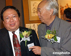 “邵華澤、李琦、馮真書畫展”六月十四日在香港大會(huì)堂開幕,圖為邵華澤與《大公報(bào)》副社長(zhǎng)在書畫展上。中新社記者:錢興強(qiáng)
