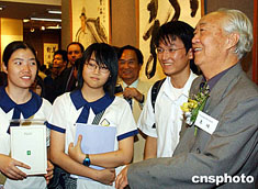 “邵華澤、李琦、馮真書畫展”六月十四日在香港大會(huì)堂開幕,是次書畫聯(lián)展共展出作品九十逾幅,圖為李琦在展會(huì)上向參觀學(xué)生介紹繪畫作品。中新社記者:錢興強(qiáng)