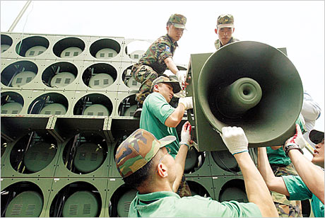 作為清除工作第1階段,到30日為止將清除臨津江北部地區(qū)的末島~板門店右側(cè)地區(qū)的宣傳工具;第2階段,從7月1日到20日清除板門店右側(cè)地區(qū)~江原道鐵原郡葛末邑之間的宣傳工具;第3階段,從7月20日到8月15日清除葛末邑~固城郡縣內(nèi)面之間的宣傳工具。