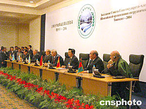 六月十七日,上海合作組織塔什干峰會元首共同會見媒體記者。從右至左是:阿富汗過渡政府總統(tǒng)卡爾扎伊,吉爾吉斯斯坦總統(tǒng)阿卡耶夫,中國國家主席胡錦濤,烏茲別克斯坦總統(tǒng)卡里莫夫,俄羅斯總統(tǒng)普京,哈薩克斯坦總統(tǒng)納扎爾巴耶夫,塔吉克斯坦總統(tǒng)拉赫莫諾夫。中新社記者:李鵬
