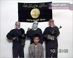 20日晚,阿拉伯“半島”電視臺(tái)播放了一段錄影帶,畫面上的武裝份子稱,除非韓國保證在24小時(shí)內(nèi)停止派兵赴伊拉克,否則他們將把一名韓國人質(zhì)斬首。綁架人質(zhì)的武裝分子自稱屬于“團(tuán)結(jié)圣戰(zhàn)組織”。該組織曾多次通過電子郵件向半島電視臺(tái)發(fā)送綁架人質(zhì)的錄像片段,或在其網(wǎng)站上聲稱對某一襲擊事件負(fù)責(zé)。據(jù)稱,該組織由恐怖頭目扎卡維領(lǐng)導(dǎo),與“基地”組織有聯(lián)系。