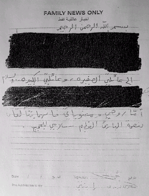 信的開(kāi)頭寫(xiě)道:“以慈悲的神的名義”,接下來(lái)有6行字被劃掉,再往下是“向我的小家庭和大家庭問(wèn)好”,下面又有3行字被劃掉,接下來(lái)的文字是“感謝老天,我的精神很好,我的士氣很高。向所有人問(wèn)好!。這封信經(jīng)過(guò)了駐伊美軍的嚴(yán)格審查,其實(shí)際內(nèi)容基本已經(jīng)不存在。魯沙旦說(shuō):“三分之二的內(nèi)容被劃掉了,只剩下17個(gè)字,根本無(wú)法理解其原意!(章田)