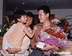 在阿富汗恐怖襲擊事件中受傷的山東諸城工人王金生六月二十三日上午傷愈出院,與前來迎接他的妻子和女兒重新團(tuán)聚。作者:胡洪林
